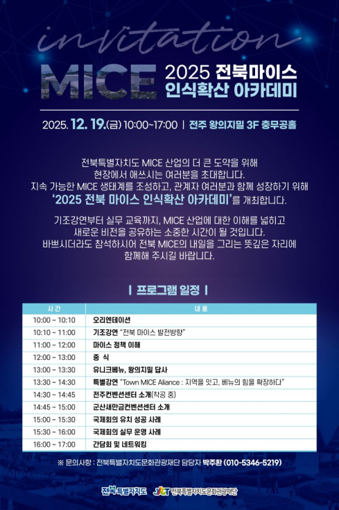 전북특별자치도문화관광재단이 전북 마이스(MICE) 산업에 대한 이해도 제고와 협력 기반 강화를 위해 '2025 전북 마이스 인식확산 아카데미'를 오는 19일 전주 왕의지밀에서 개최한다.